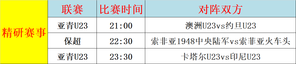 1、澳洲U23vs约旦U23:澳洲U23近10战6胜3平1负,近期状态正盛,约旦U23近10战5胜2平3负,表现稳定,但是不擅长客场作战,双方并不陌生,本场约旦有半个主场的优势,能利用好这个优势吗?