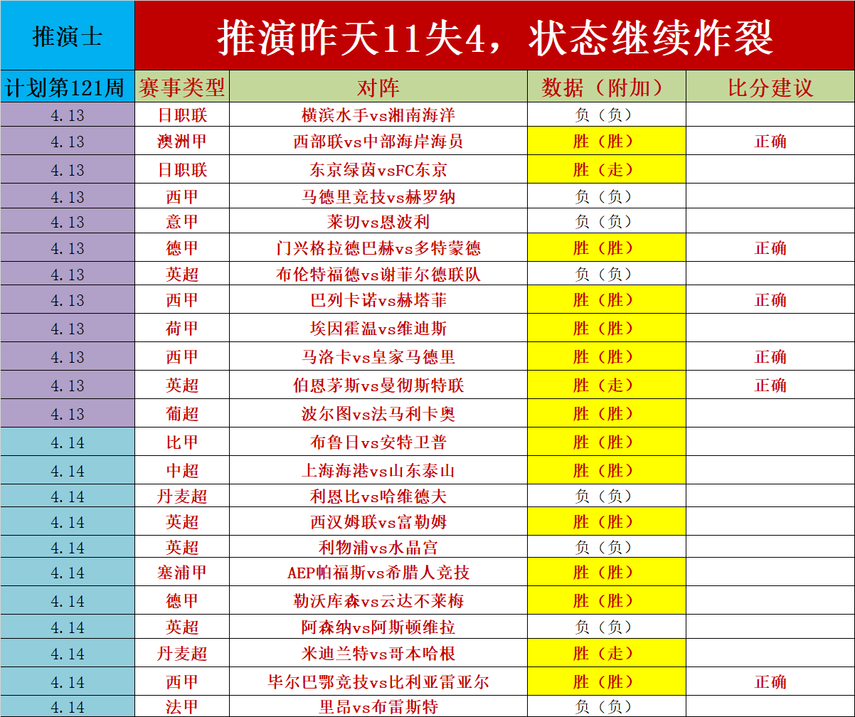 2、推演士计划第121周(走不纳入统计)完美结束,上周净增+3场,预测17场比分正确,持续的保持了高效的稳定。