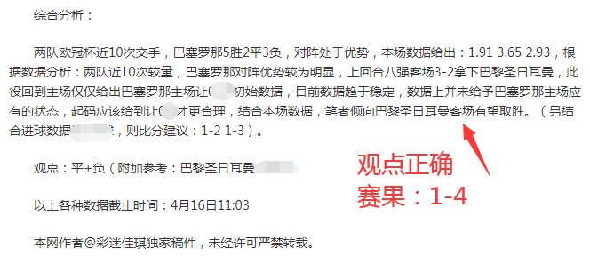昨日亚冠由于天气原因,推迟一天进行,欧冠赛事2胜1战绩,巴塞罗那主场1-4不敌巴黎圣日耳曼,巴黎圣日耳曼进入欧冠四强,观点方向符合笔者预期。