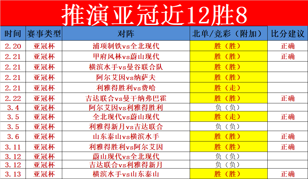 1、昨天状态稳定,3场取胜1场走的战绩,含金量十足,共击中了1场比分,近四天共击中了9场比赛,昨天亚冠杯延续到今天继续,今天亚冠杯继续(走不纳入统计)