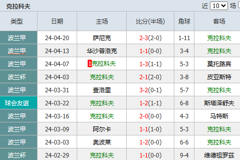 2、克拉科夫的主客场实力较为均衡,目前14轮客场战罢,他们5胜5平4负。