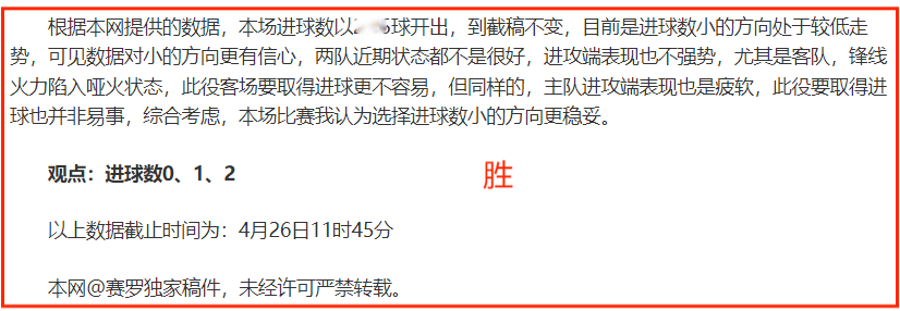 (温馨提示:观点回顾为已完场赛事的统计,并不能代表未来的观点预测结果走势,观点仅为其个人意见,与平.台无关。资讯仅供体育爱好者浏览,并不构成购.彩建议,任何人不得用于非法用途,请广大用户理性消费。)