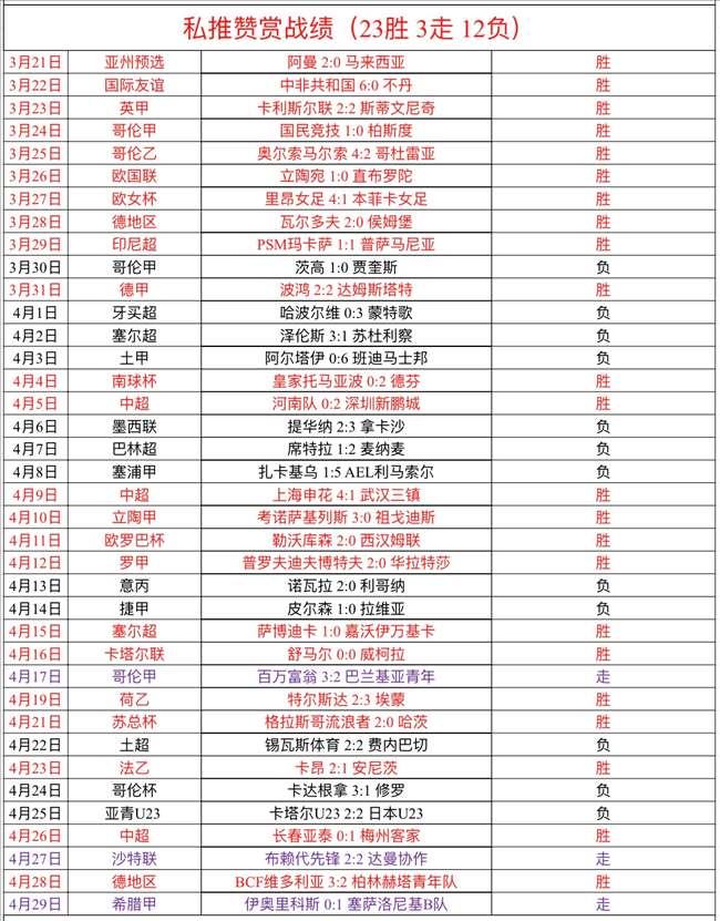 周一私推赞赏1场走了,被逆转没能取胜很可惜,私推赞赏依然近35胜23,状态稳定!私推总进球数1场走了,上半场就2个球没有打出很可惜!解锁文章2场,结果1走1负,解锁文章近36胜25,成绩不俗!