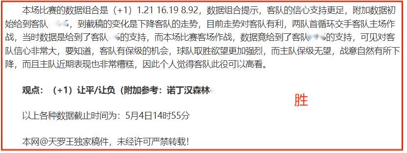 (温馨提示:观点回顾为已完场赛事的统计,并不能代表未来的观点预测结果走势,观点仅为其个人意见,与平.台无关。资讯仅供体育爱好者浏览,并不构成购.彩建议,任何人不得用于非法用途,请广大用户理性消费。)