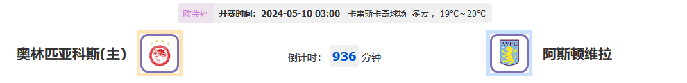 北京时间05月10日03:00,2023-2024 欧洲协会联赛,奥林匹亚科斯vs阿斯顿维拉,两队首回合奥林匹亚科斯占据优势,今天比赛回到主场能否顺利取胜?
