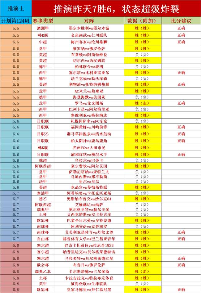 3、推演士计划第124周完美结束,上周保持稳定,预测12场比分正确,持续的保持了高效的稳定(走不纳入统计)。