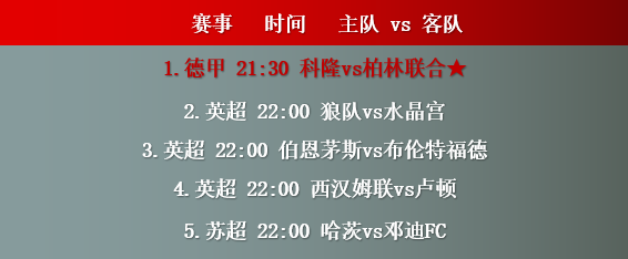 1.科隆vs柏林联合★,科隆赛季16轮主场比赛取得3胜4平得分表现,攻守端数据发挥严重失衡,得失比超过了1:2,除了中前场的锋线至今未能突破场均合格的1个进球以外,后防线上的稳定程度也是相当不让人省心,赛季16轮主场下来只有3战能够实现零封对手的发挥,在捍卫尊严的进程上无法得到更多支持,目前科隆以24个积分处于联赛的降级位置,剩余2轮比赛已没有多少机会可以摆脱保级区间,但还是可以向着保级名次的美因茨发起一些冲击争取一下,本轮迎战对手是处于德甲保级安全区边缘的柏林联合,后者赛季16轮作客比赛取得2胜4平得分表现,攻守端数据发挥严重失衡,得失比接近去到1:3,其中的主要弱项体现在客场的破门能力方面,柏林联合赛季至今的作客场均进球只有可怜的0.6个,异地对赛的制胜能力只有13%,目前柏林联合仅比身后的美因茨多出1分优势,剩余的2轮比赛还是面临着巨大的抢分保级压力,在近期赛程里柏林联合已经连续6轮比赛无法取得胜利,仅仅在2场作客比赛里勉强逼平对手取得2分的缓慢进度,赛季的整体表现与上季的欧冠名次形成强烈反差,剩余的2轮比赛对于积分的渴望不比本场主队要低。