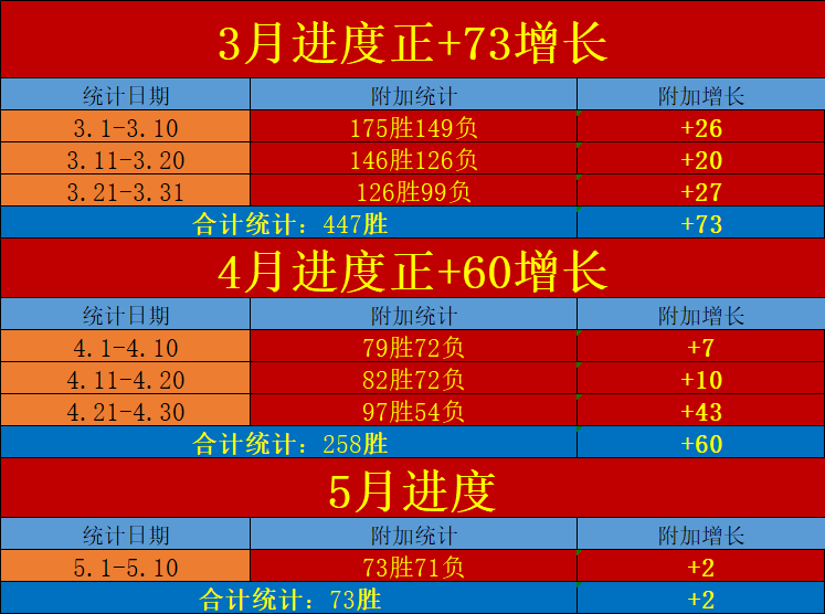昨日已完成赛程拿下4场胜利,在常规场次里受到了欧洲赛事收官赛程波动的一些阻击,5月上旬进度取得73场胜利观点并稳定在正向的增长区间,通过对上旬前期的赛程累积并延续了过去4月进度胜利转化的正向净+60增长,整体的数据表现承受住了数据造冷的冲击保持了正向位置收官,笔者的第22个胜利旬计划成功捍卫。对于近期数据赛程的冷意笔者重新作出了针对性的评估分析,本日是5月中旬计划的开启首日,同时也是本次周末收官赛程的关键节点,继续精选值得关注的焦点赛程出击,争取以优秀的起步奠定5月中旬计划的冲击基础!