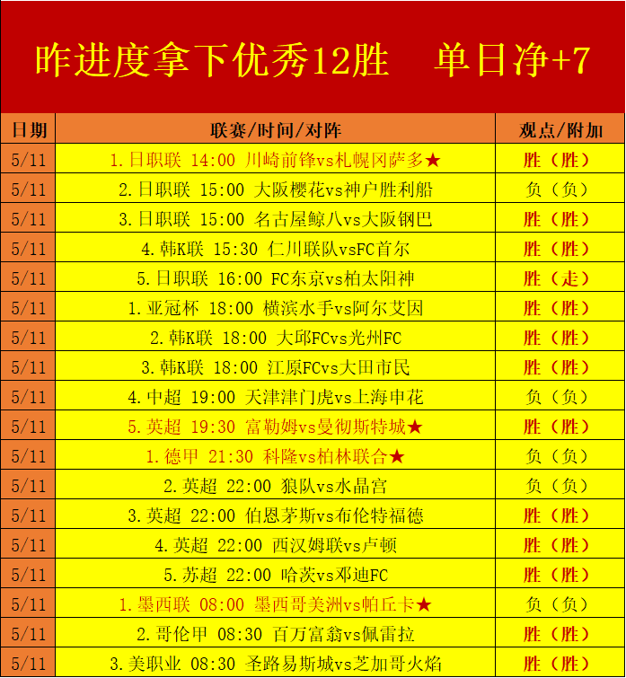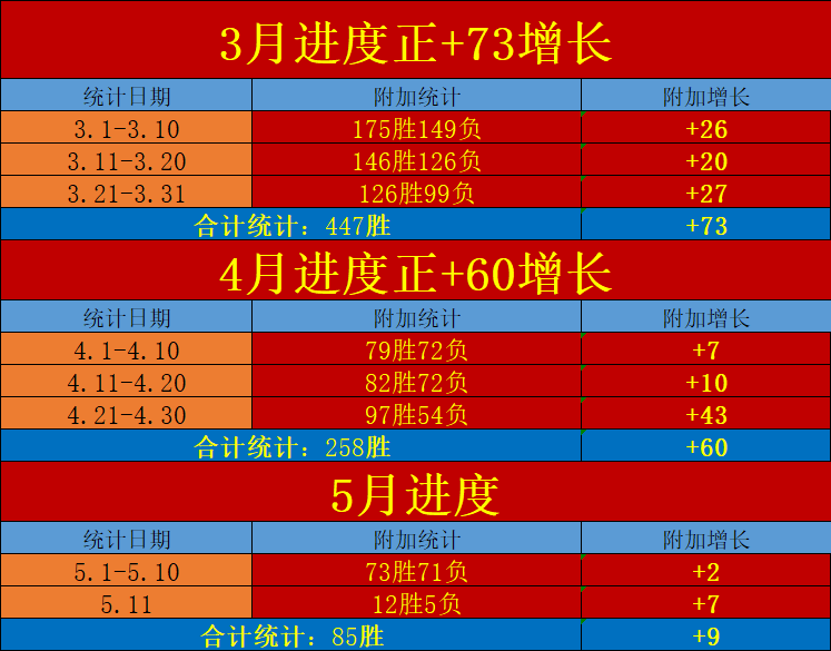 昨日已完成赛程拿下12场胜利,完成的各个板块均保持着稳定的数据击中能力,单日取得净+7的优质正向增长!5月合计进度取得85场胜利观点并稳定在正向的增长区间,通过对上旬前期的赛程累积并延续了过去4月进度胜利转化的正向净+60增长,笔者的中旬计划以一个优秀的正向姿态开启赛程。对于近期数据赛程的冷意笔者重新作出了针对性的评估分析,继续精选值得关注的焦点赛程出击,争取以优秀的起步奠定5月中旬计划的冲击基础!