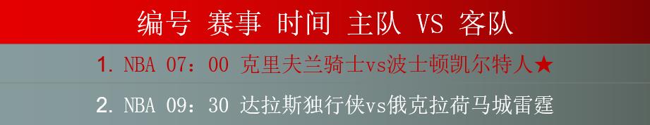 1.克里夫兰骑士vs波士顿凯尔特人,骑士上一场比赛遗憾不敌凯尔特人,骑士半场就落后对手9分,骑士阵中有4人得分上双,米切尔拿到了33分的高分数,而加兰德、莫布利还有勒维尔的得分都上双,遗憾的是斯特鲁斯和奥科罗两人的状态下滑严重,首发出战的两人合计得分只有8分,另外阿伦的缺阵使得骑士的护板能力不足,此役骑士将如何调整?凯尔特人顺利在客场复仇骑士,阵中有4人得分上双,塔图姆拿到了33分的高分数,而布朗本场比赛也是非常强硬,拿到了28分,另外霍勒迪和怀特的得分都上双,而霍福德虽然只拿到2分,但是霍福德的防守非常强硬,球队的士气高涨,此役凯尔特人能否客场拿到赛点?