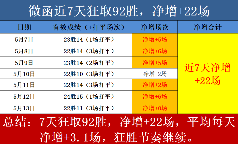 1、昨天拿下11胜3平的成绩,继续保持稳定,7天拿下92胜,近7天净增+22场,平均每天净增+3.1场,昨天主要的高光表现是4场欧洲主流联赛,打出3胜1平的不败成绩,今天继续回有欧洲主流联胜,今天继续狂胜节奏。