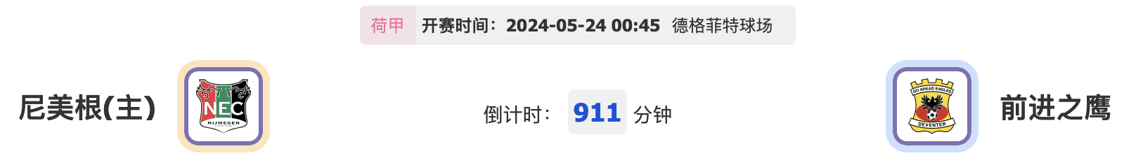 北京时间5月24日凌晨00:45,荷甲欧会杯资格赛的比赛将会继续展开,奈梅亨队将会在主场迎来前进之鹰队的挑战,球队能否在主场顺利拿下胜利呢?