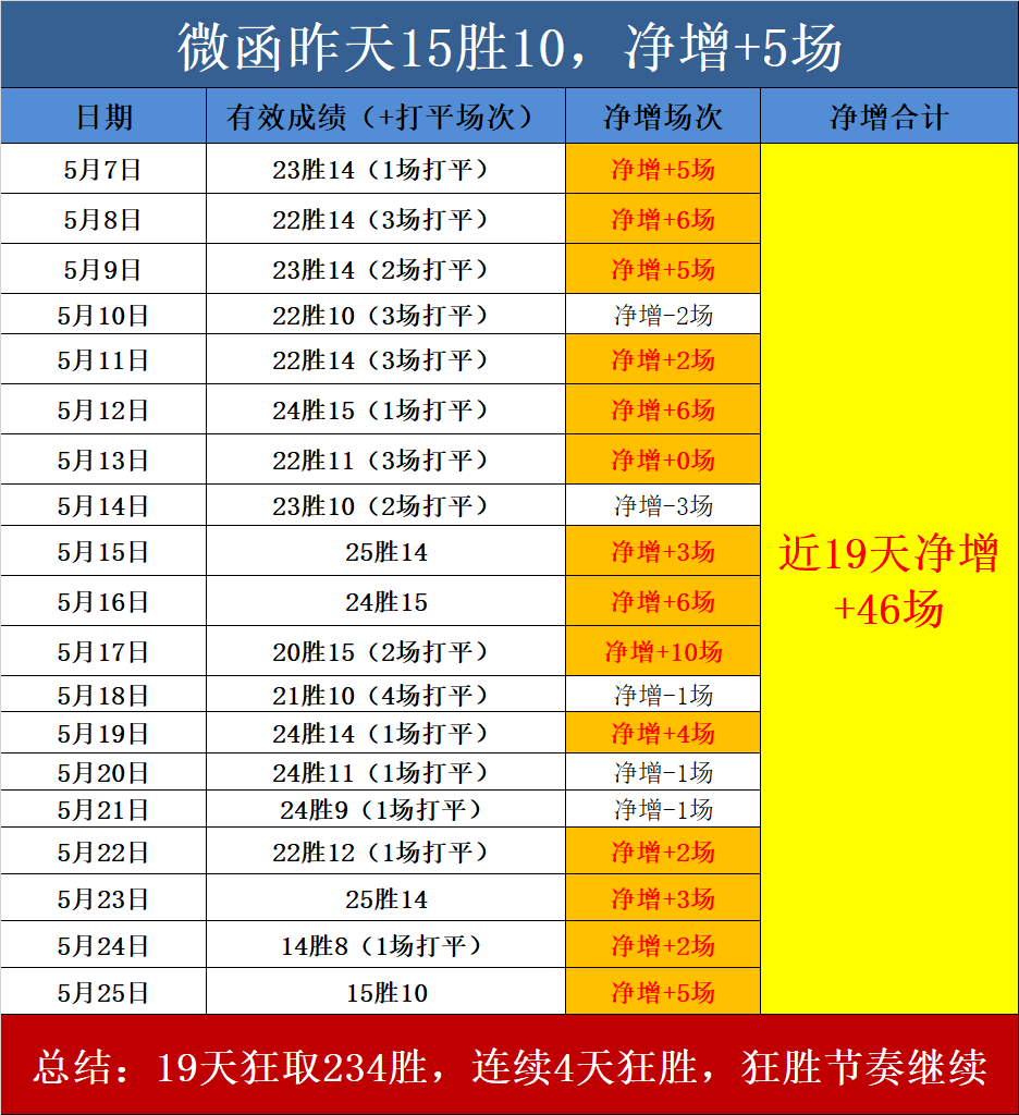 1、昨天再次狂胜,取下15胜10的成绩,净增+5场,继续保持狂胜的态势,目前近19天共拿下234胜,19天净增+46场,今天狂胜节奏继续,已经连续4天狂胜。