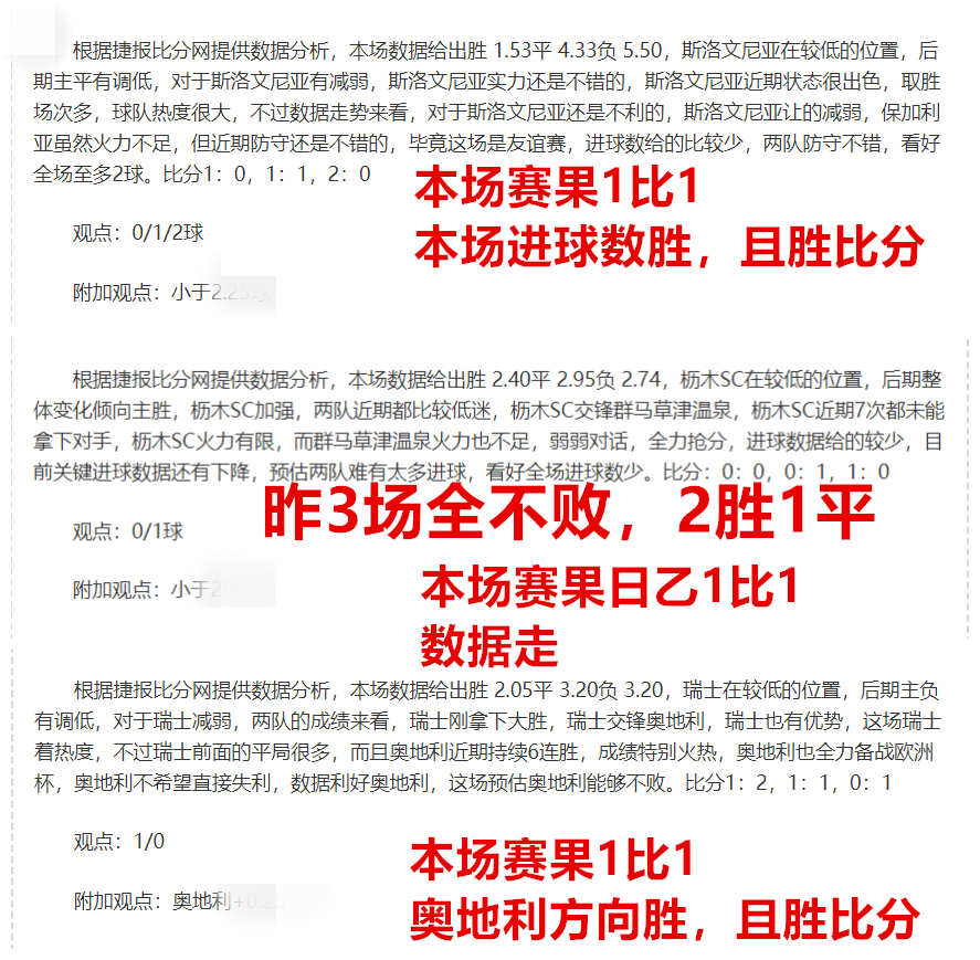 昨日精选的3场全不败,2胜1平!国际友谊斯洛文尼亚进球胜,且胜1比1比分,后续奥地利方向再胜,且继续胜比分,日乙进球打平,目前精选3场全不败(还有场早上的未结束)!感谢兄弟们的支持,今日好好全力战,只精选好的赛事,争取能够大胜拿下!好好出击,再创佳绩!——今日重点参考乘胜追击!老铁们一起冲!