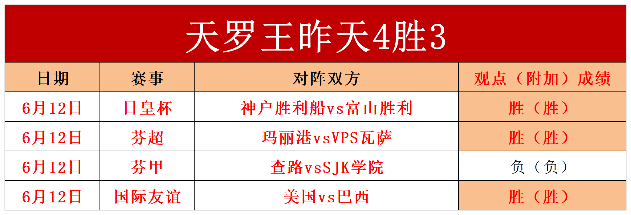 昨天状态炸裂,4场比赛拿下了3场胜利,第一场日皇杯:神户胜利船2-0富山胜利,主胜方向精准拿下,第二场芬超:玛丽港0-0VPS瓦萨,进球数小方向准确打出,第三场国际友谊赛:美国1-1巴西,主队方向再打出。值得称赞的是笔者近期分享的21场友谊赛只有5次失手,并且拿下13胜的优秀战绩,今天我们再接再厉。笔者分享的赛事涵盖范围广,有欧洲主流联赛,美洲主流联赛,亚系热门赛事,各类杯赛等等,笔者推.荐的方式有胜负和进球数建议,对于各种赛事笔者会反复琢磨数据的变化,全方位研究赛事的动向,以达到方向的顶值,今天的几场重点赛事经过了昨晚一夜的反复测试和研究,信心很足,切勿错过。