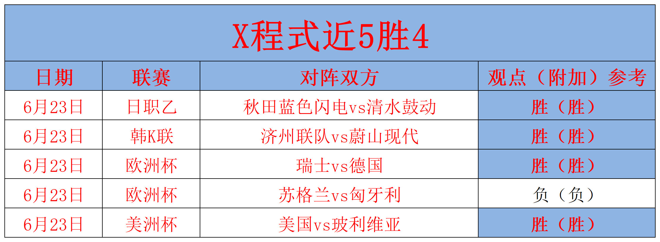 昨天表现非常惊艳,5场比赛拿下4场,早场日职乙秋田蓝色闪电3-1清水鼓动,秋田方向轻松拿下,接着韩K联济州联队2-3蔚山现代,进球数大方向继续拿下,后面欧洲杯瑞士1-1德国,瑞士方向以及美洲杯美国2-0玻利维亚,美国方向都准确拿下,今天继续追击,期待连胜。