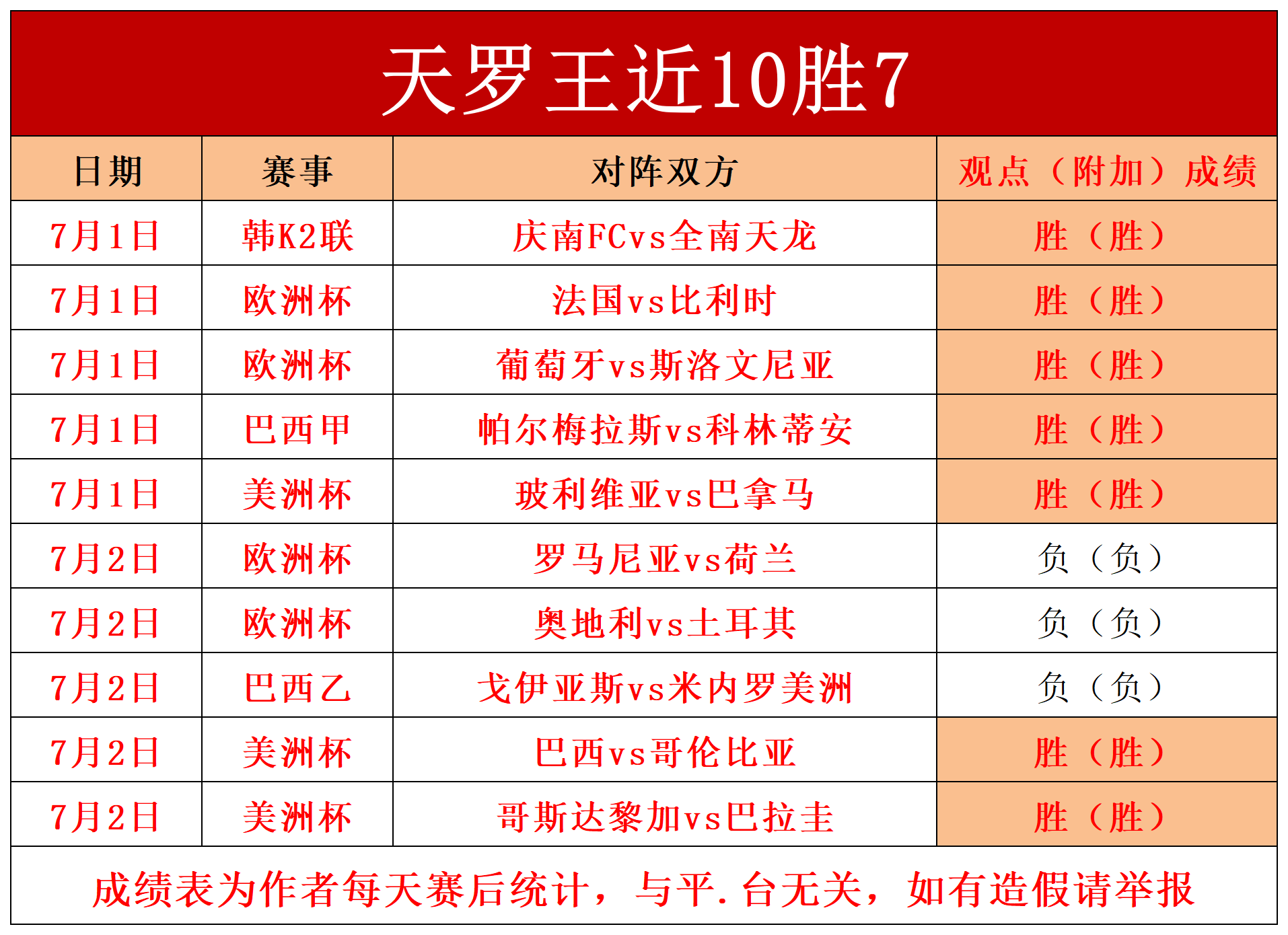《战绩回顾》昨天的巴西乙和欧洲杯判断失误,不过今天早上2场美洲杯全胜,表现还算不错,近期整体战绩10胜7,保持稳定,今天我们再接再厉。