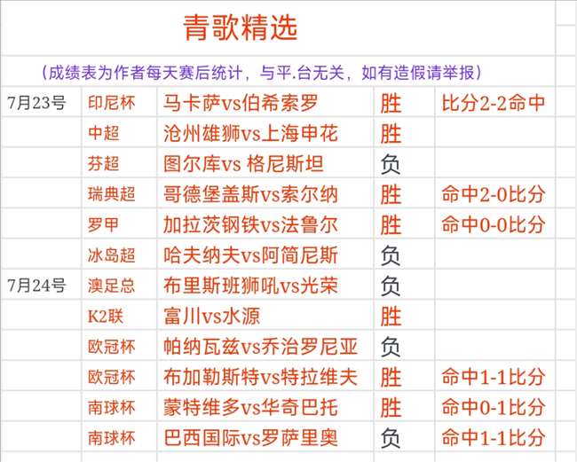 【昨日回顾:昨日澳洲比较遗憾,拿手韩系倒是稳稳打出,晚场以及早场都是欧冠以及南球杯各两场,均是2√1,最后一场是最遗憾的,没想到巴西国际既然放弃再次进攻的打算,也是特地考虑到了这个局面,因此在负半胜全的背景下做出了1-1的建议,接下来青歌将继续选取质量上佳的比赛以回馈粉丝们的支持,帮助粉丝们避免选择困难症的疑虑!】