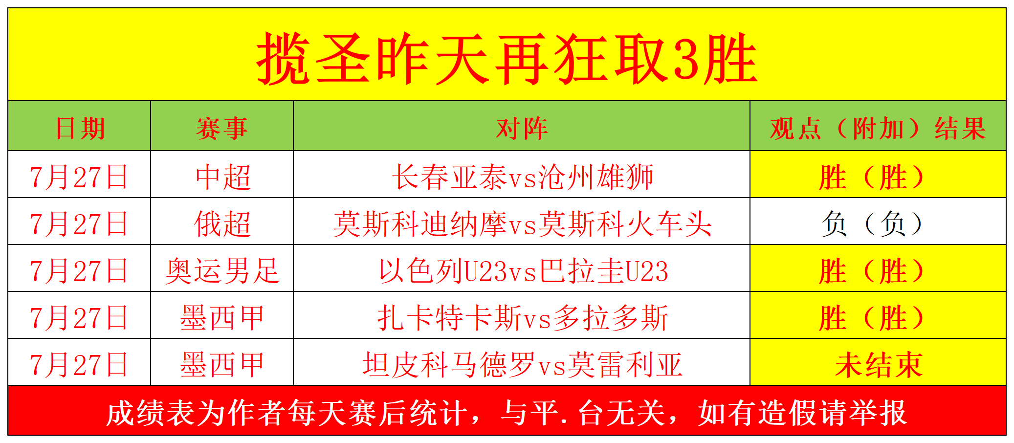 成绩回顾:昨天再次狂取3胜,首先是中超长春亚泰vs沧州雄狮,沧州雄狮不会大败拿下;其次是奥运男足以色列U23vs巴拉圭U23,巴拉圭U23胜拿下;最后墨西甲扎卡特卡斯vs多拉多斯,多拉多斯不会大败再拿下。另外还有一场墨西甲未结束,笔者相信问题不大。今天我们再接再厉!足球比赛是追求长期的稳定,长期的关注才能得益,一时的下滑并不意味着失败,大家不要因为一时的下滑而放弃关注,笔者会努力挖掘更精准的赛事分享给大家,感谢大家的支持。