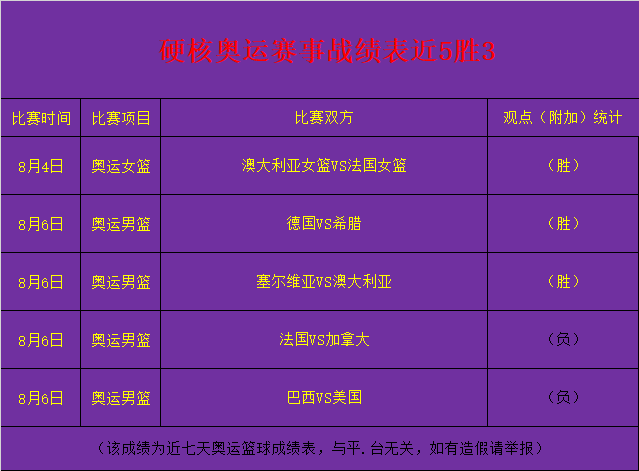 【成绩回顾】作者在昨日奥运男篮拿下了两战胜利!近期奥运篮球赛事取得了近5战取3胜的成绩!在今日众多赛事中选取信心赛事!今日赛事质量可以!咱们继续胜起来!