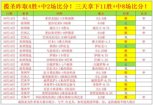 成绩回顾:昨天继续保持正向增长!昨天拿下4胜,击中2场比分!近三天拿下11胜,击中8场比分!近期整体状态稳定,今天我们再接再厉!