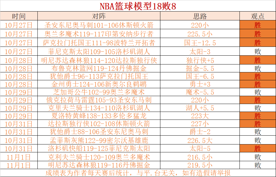 昨天的2场NBA模型发挥失准,本来还有另外两次NBA模型要分享,那两场比赛是胜的,遗憾的是来不及分享出来;NBA篮球模型18败8,今晚的NBA会更加做好准备,争取反弹。