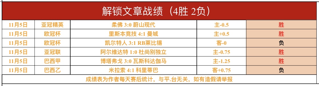 战绩回顾:昨日解锁文章6战拿到4胜2负的战绩,成绩不俗!欧冠里斯本竞技、亚冠柔佛、亚冠联阿尔维达特和巴西甲博塔弗戈胜利,欧冠莱比锡和巴西乙科里蒂巴没有打出!