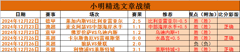 【上期回顾】状态火热,厚积薄发!昨整体4胜3+拿下2场1490%比分。文章3胜2,文章近6胜5;包周1胜1,包周近8胜7!水晶宫、莱斯特城、包周利兹联全部打出,拿手澳超16胜15。昨净增1场,本周净增3场,今天继续冲正向上分!